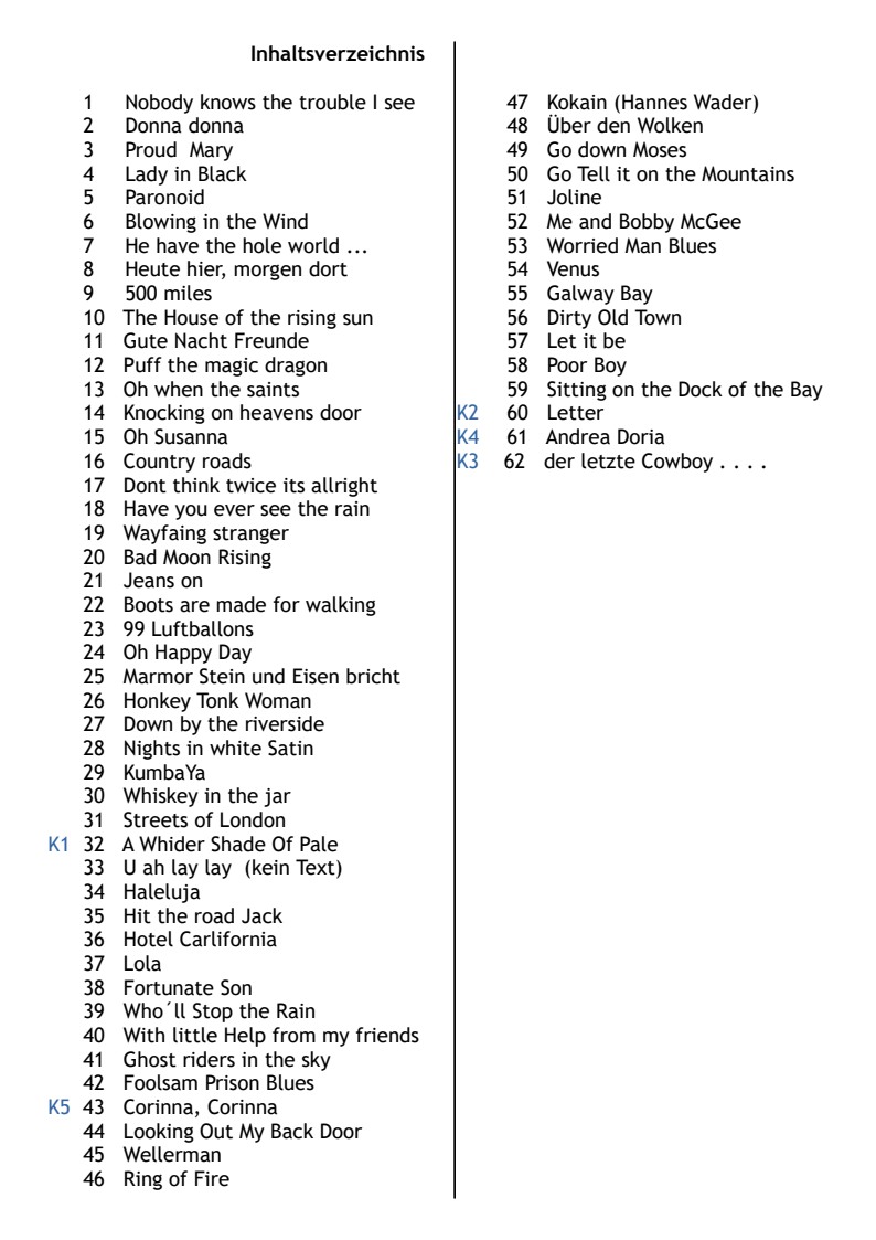 Die aktuelle Liedliste findet ihr hier http://luki.crosshagen.de/Inhaltsverzeichnis.jpg